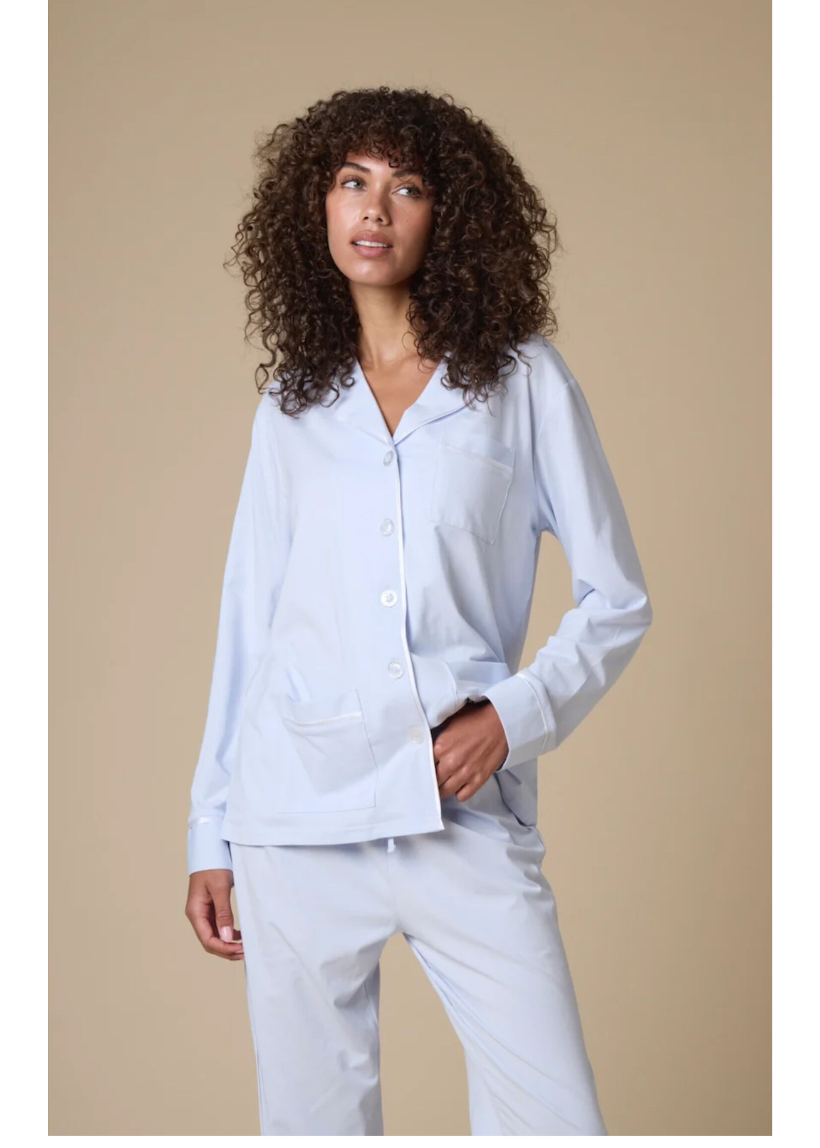 - mother-of pearl buttons and modern pocket details